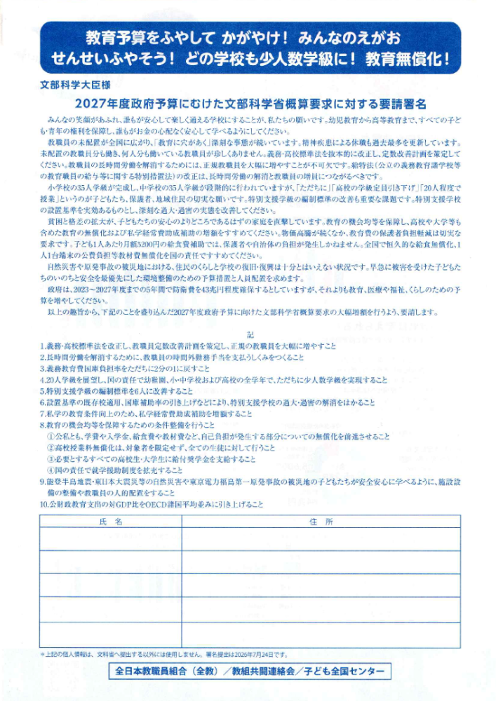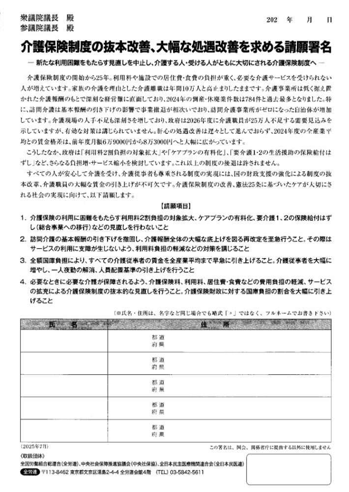 日頃より、当労働組合の活動にご理解とご支援を賜り、誠にありがとうございます。 現在、私たちは賃上げや労働環境などの改善を目指して重要な署名活動を支援しております。 皆様のご協力をいただきたく、署名をお願い申し上げます。皆様の声が大きな力となり、より良い労働環境を実現するための大きな一歩となります。 署名は以下の送付先までお送りください。送付先高知市江陽町1-12 2階江陽第二事務所よさこいユニオン どうぞ、ご支援いただけますようお願い申し上げます。