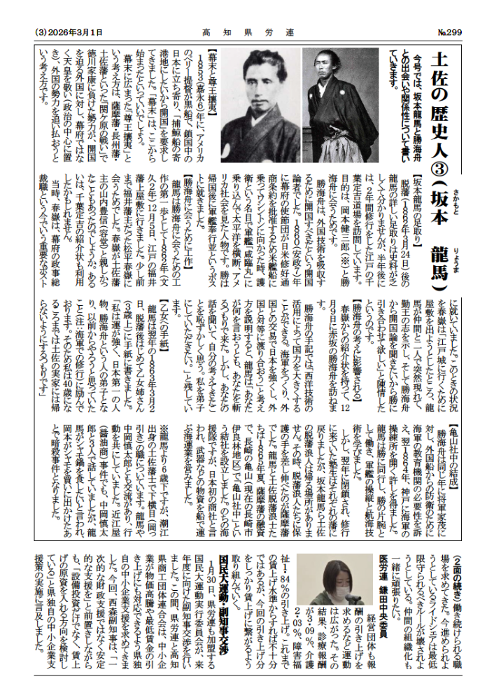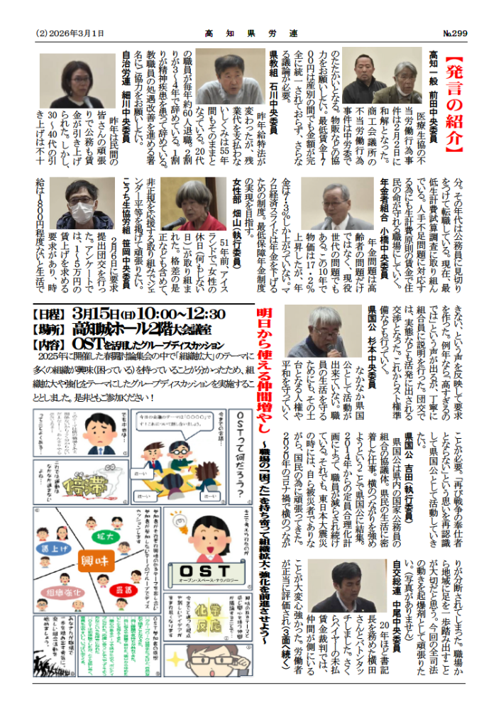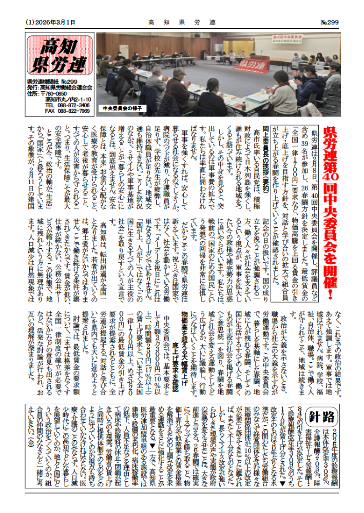 岡上委員長は、「軍事費拡大が進む一方で、医療・教育・自治体が疲弊している」と指摘し、「生活保障こそが最大の安全保障」と述べた。また、高知県の転出超過が全国最多である現状について、「若者が出ていくのは郷土愛の問題ではなく、働き続ける条件が壊されてきた結果」と分析し、春闘を通じて地域に人が残れる条件整備の必要性を強調した。